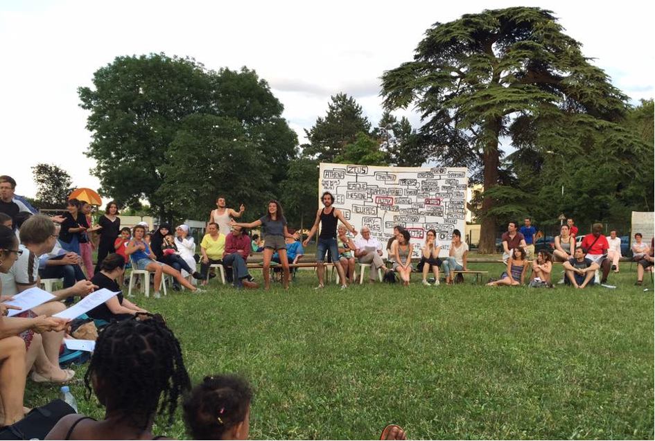« Ici / quartier Janin /Œdipe de Sophocle par la troupe du Théâtre du Point du Jour, les 8, 9, 10 juillet à 20h / Gratuit / Venez nombreux ».